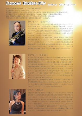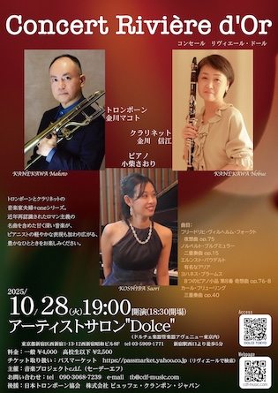 4月に出演させて頂いた音楽ネットワーク「えん」のコンサートで共演し、演奏も人柄も好印象だった小柴さん。トロンボーン+クラリネット+ピアノの今回のコンサートでも全曲に渡ってご活躍頂きます。