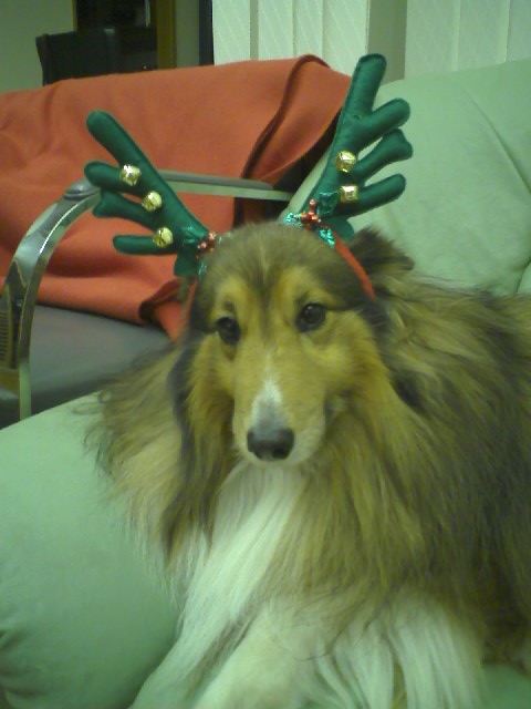 はい、眠そうなシェルティーは、トナカイになったり、サンタになったり、湯たんぽになったり、「もう、静かに寝かせてくれ〜」。